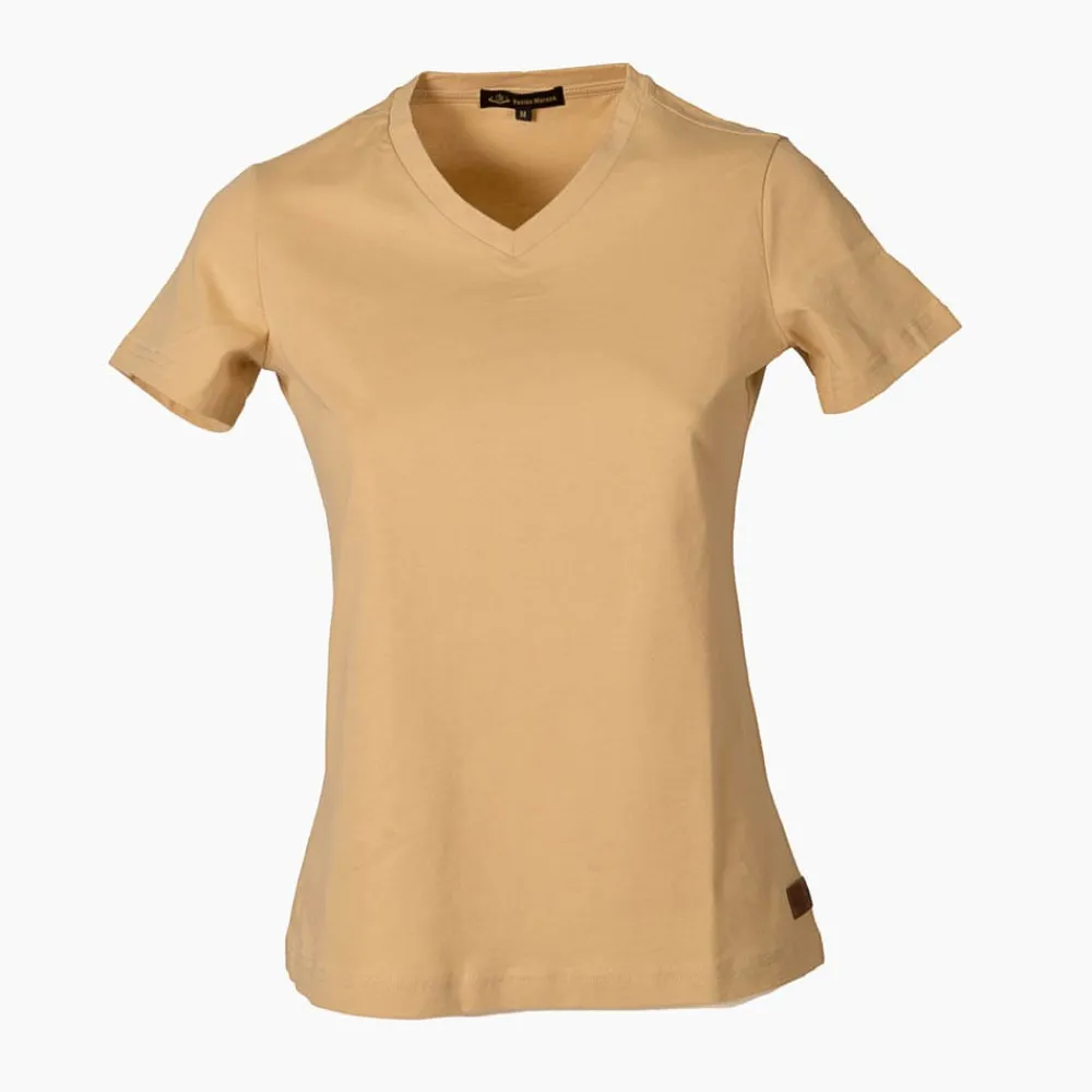 El diseño de la camiseta Camel es muy versátil y fácil de combinar, gracias a su color neutro que combina perfectamente con cualquier prenda de tu armario. Además, su escote a pico y manga corta la hacen ideal.